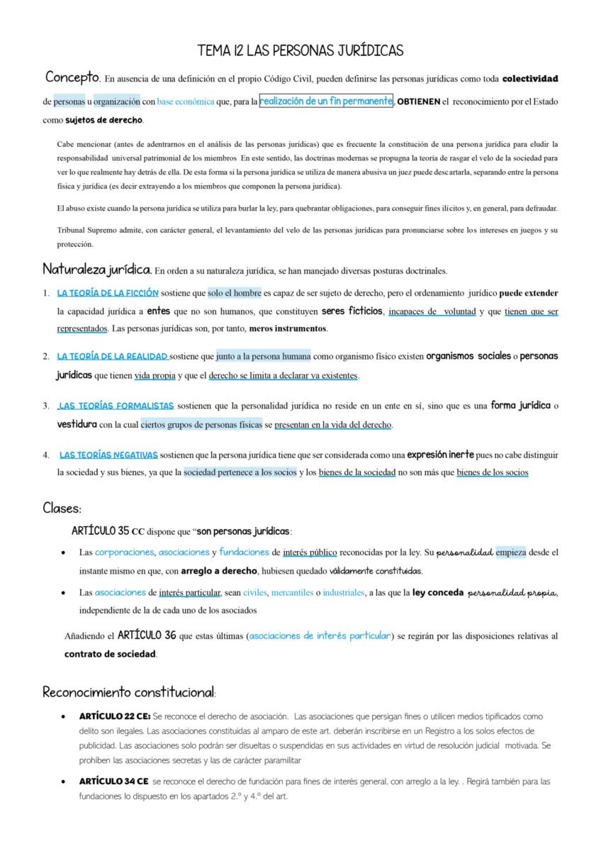 Tema feísimo el de las personas jurídicas. Difícil de estructurar y nada interesante. Un toquecito de color, una disposición diferente (en este caso, páginas en horizontal y vertical para no aburrirnos) y remisión completa a la Ley Orgánica de Asociación y a la Ley de Fundaciones ¿Para qué andarnos con tonterías si podemos poner los artículos ordenados? 3022 palabras intentando amenizar.