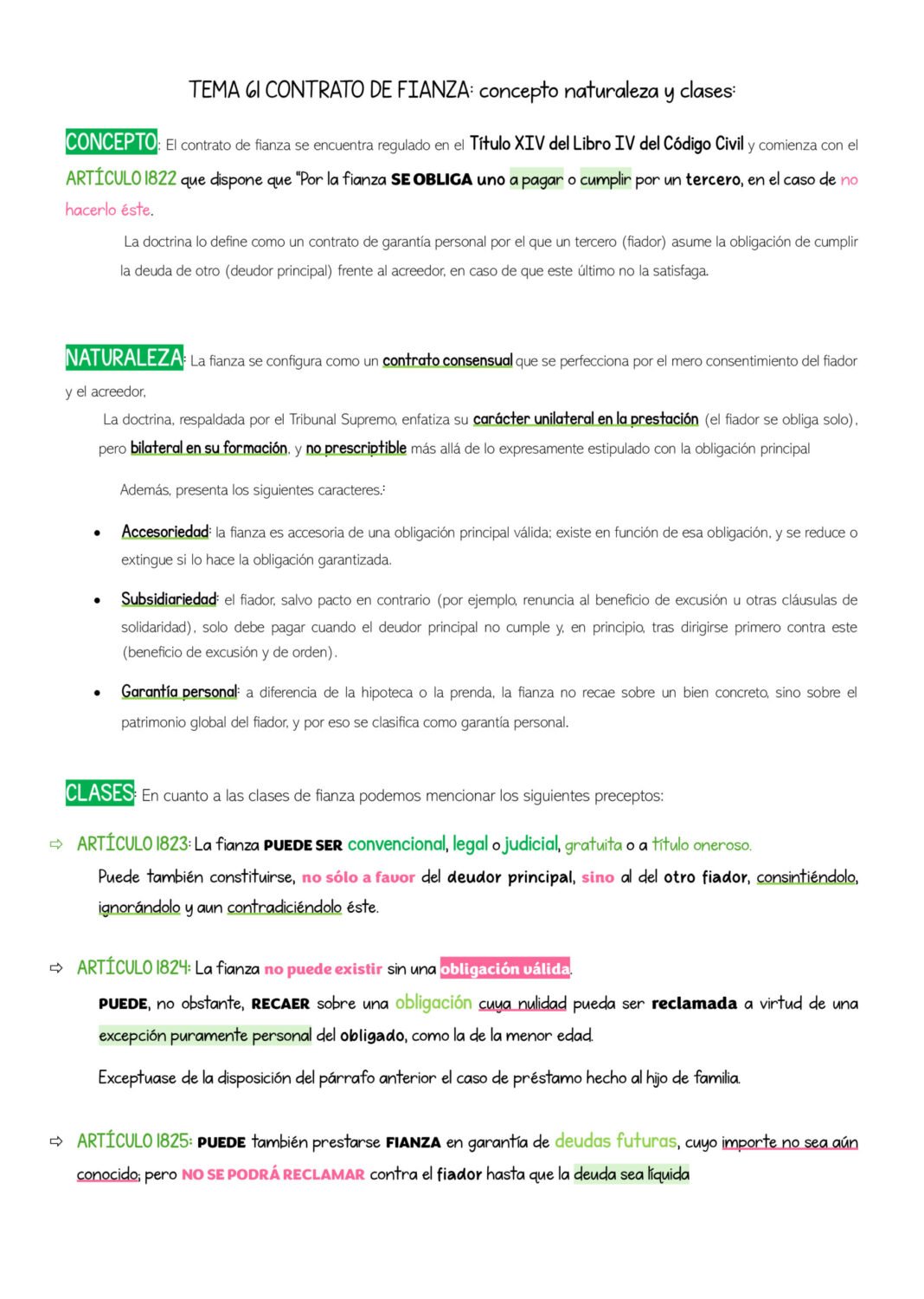Gracias a dios el tema de la fianza permite ordenar los artículos echándole un poco de imaginación. Para mi lo peor de este tema es el hecho de que poniendo solamente los artículos queda corto lo que obliga a desmenuzarlos y comentarlos. Mi plan consistía en poner los artículos en orden y, una vez expuesto comentar un poco pero sin alterar la estructura. El resultado fue 2851 palabras en color.