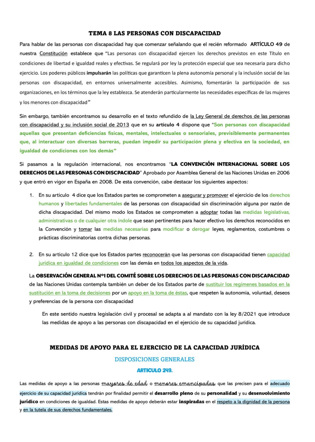 Las personas con discapacidad; la Convención Internacional sobre los Derechos de las Personas con Discapacidad. Las medidas de apoyo para el ejercicio de su capacidad jurídica: criterios generales. Las medidas voluntarias. La guarda de hecho. La curatela: autocuratela y nombramiento del curador. Ejercicio de la curatela. Extinción. El defensor judicial.